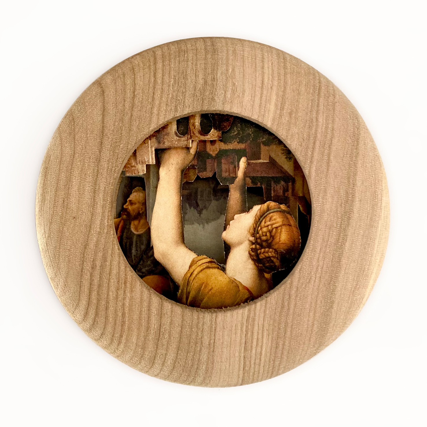 Collage emplazado en pieza de madera/